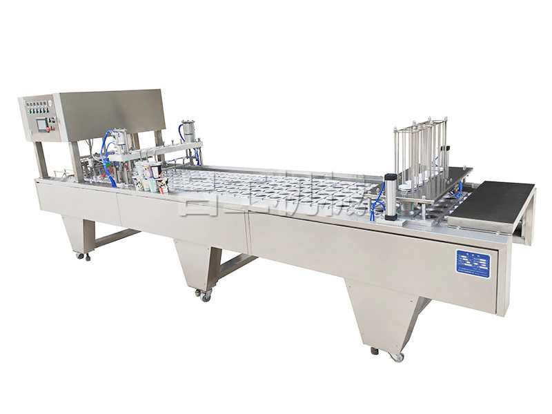 本機采用合理的機械傳動,功能齊全,灌裝、封口、切邊、制品推出,廢料收卷,印碼等自動化工作,可節(jié)約人力,降低成本。本機有二次熱封裝置,料杯/碗/盒與封膜經(jīng)過前后二次熱封,封口牢固可靠。